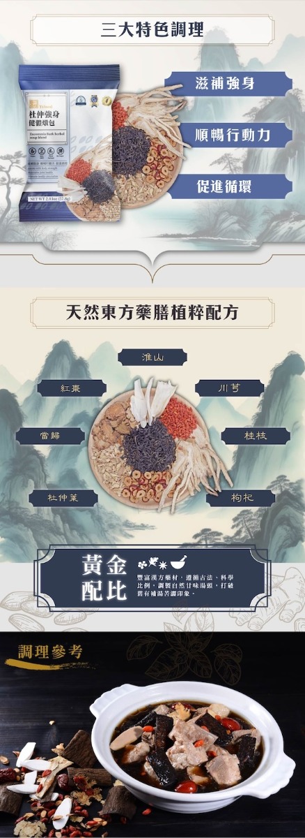 產品成份:杜仲葉、當歸、紅棗、淮山、川芎、桂枝、枸杞 (Eucommia leaf, Chinese Angelica Root, Jujube Fruit, Chinese Yam, Chuanxiong Rhizome, Cassia Twig, Wolfberry Fruit)