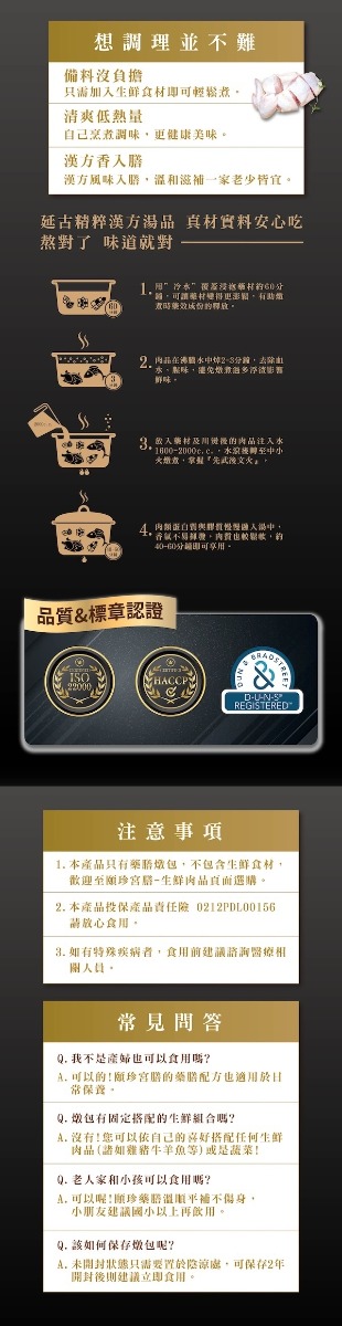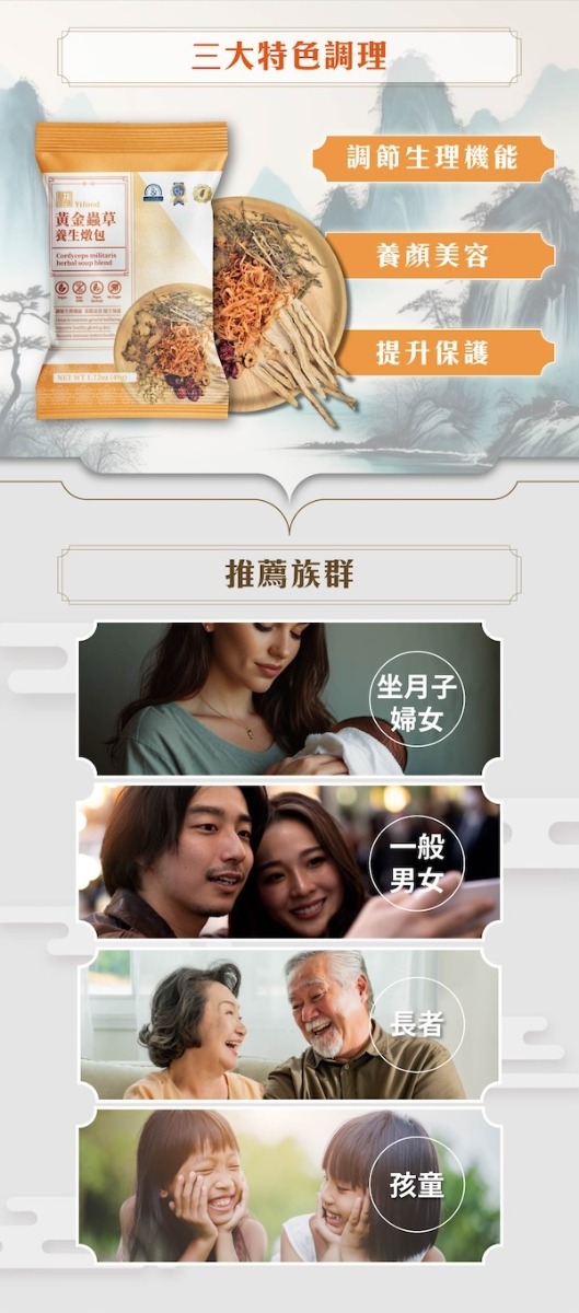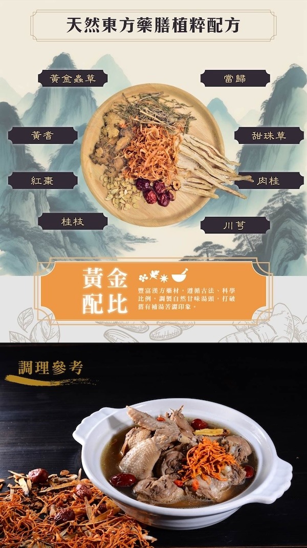 產品成份:北蟲草(蛹蟲草/黃金蟲草)、黃耆、紅棗、桂枝、當歸、甜珠草、肉桂、川芎